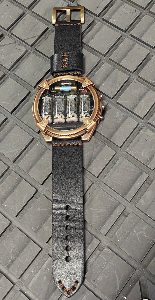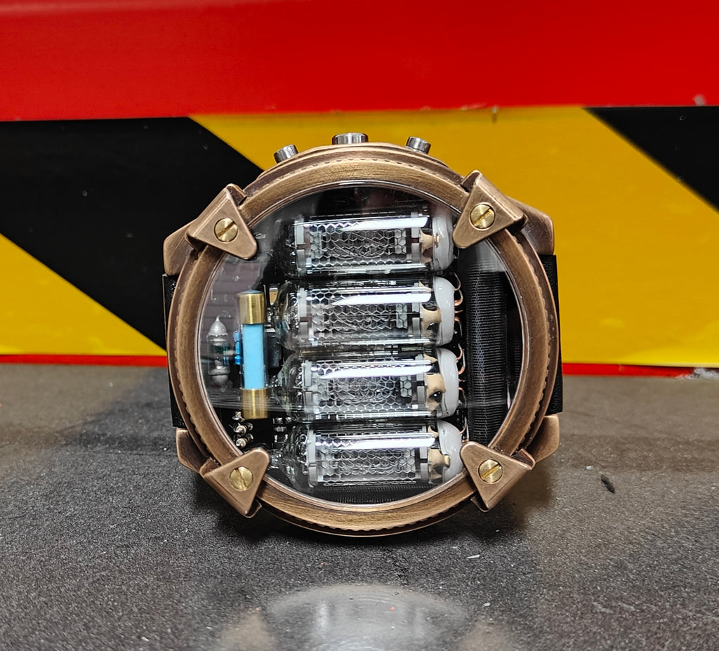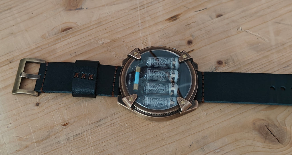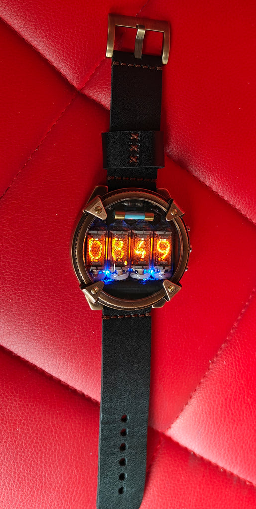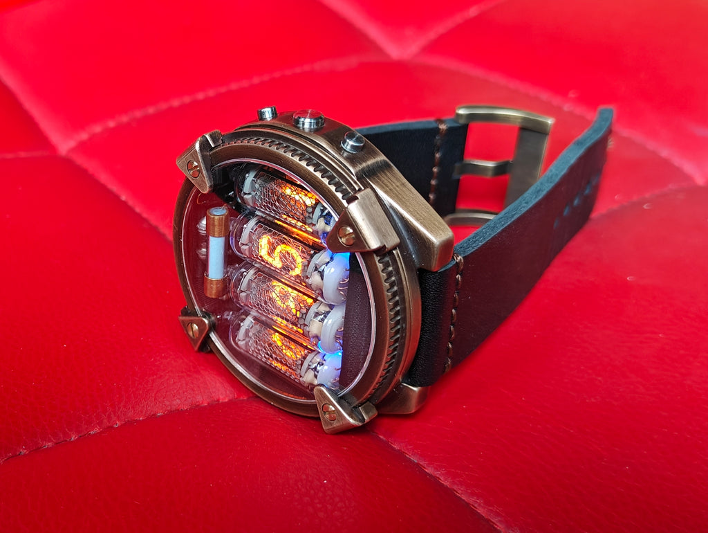 New, original, Handmade Bronze, sapphire glass, wrist watch with 4 Nixie tubes and accelerometer.